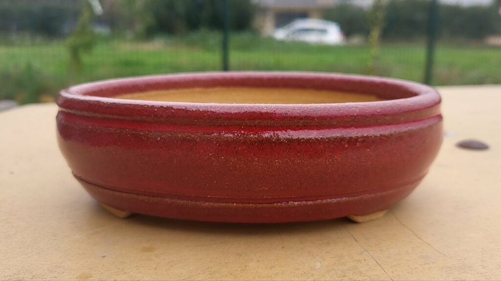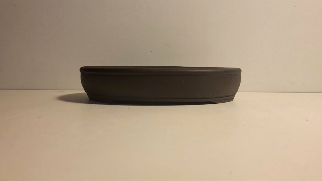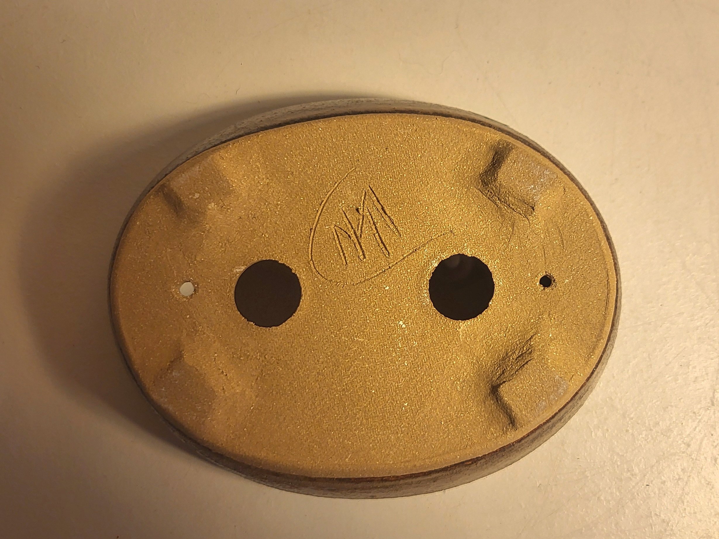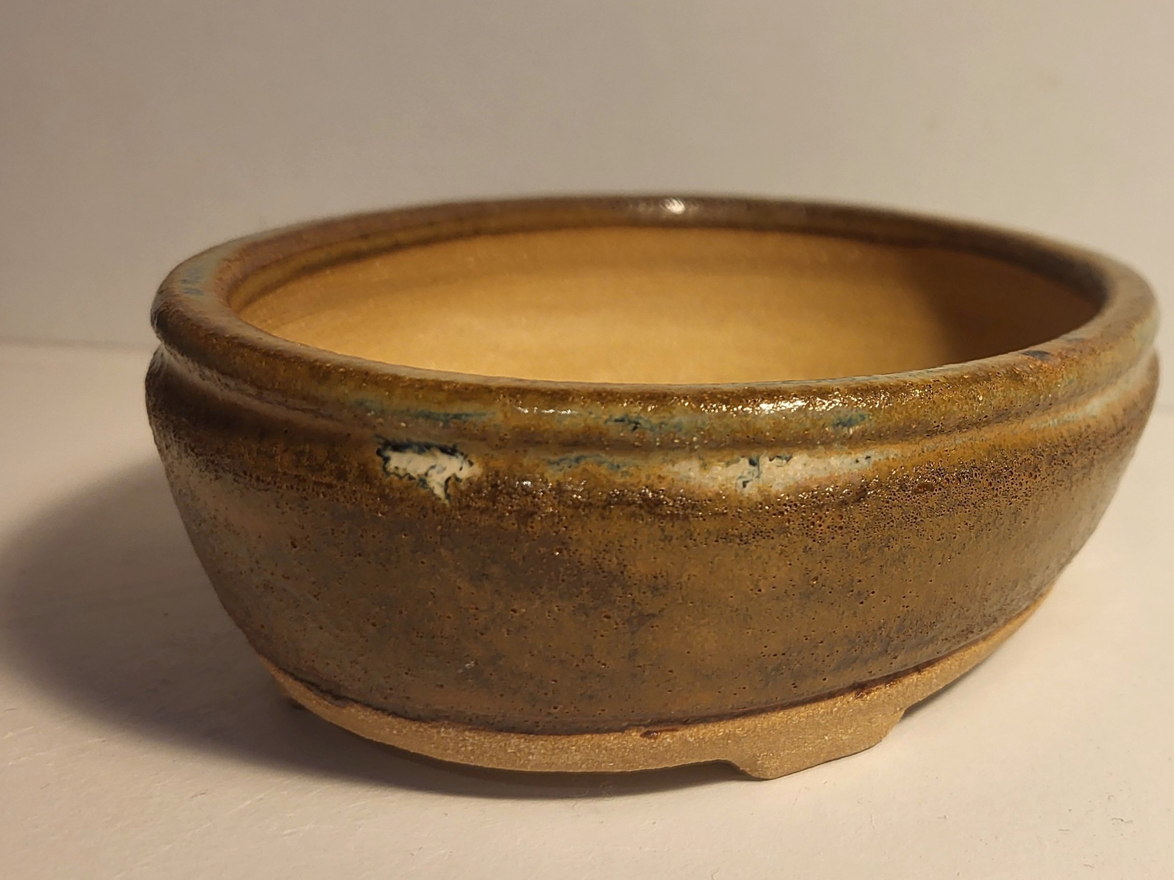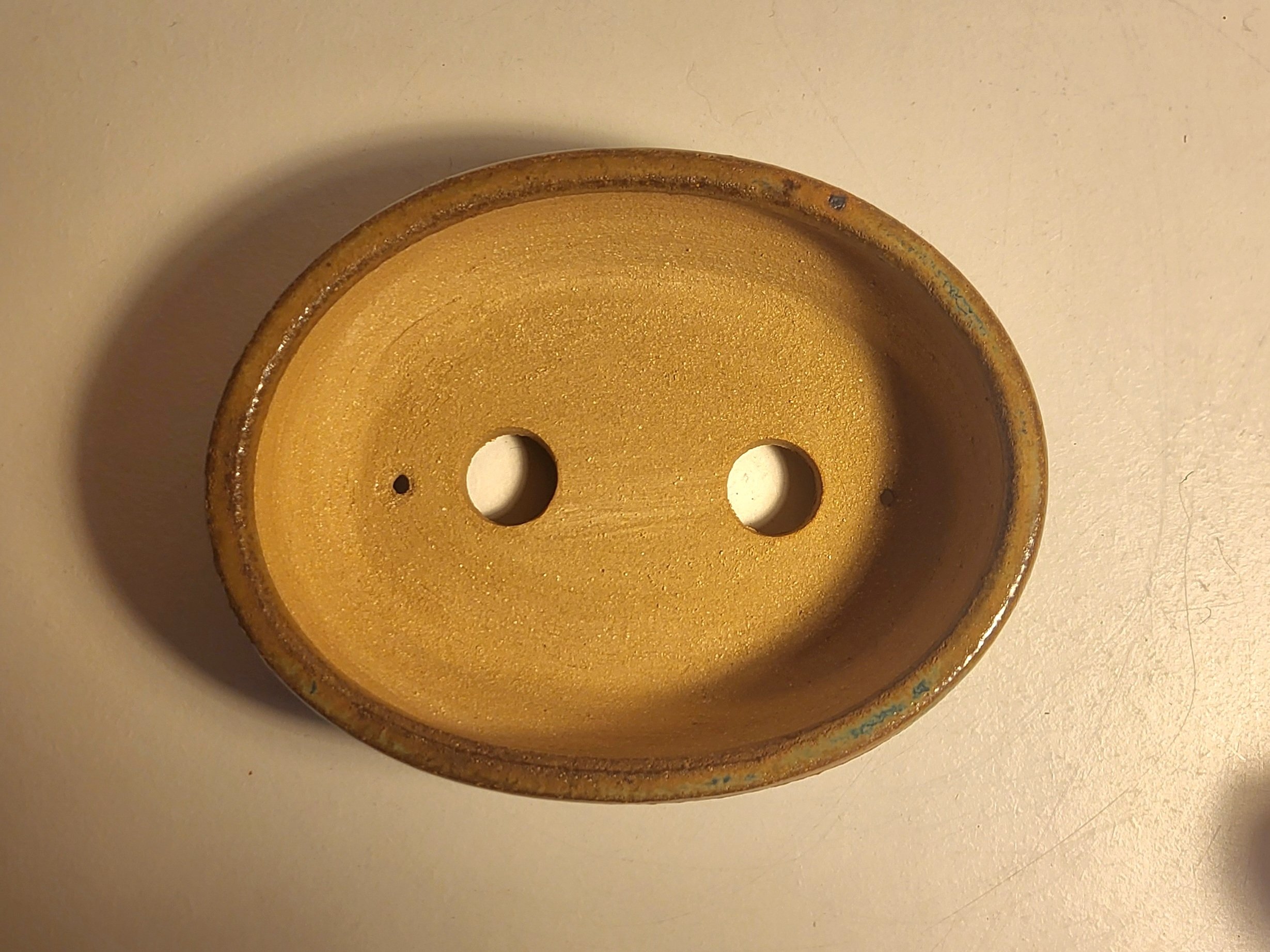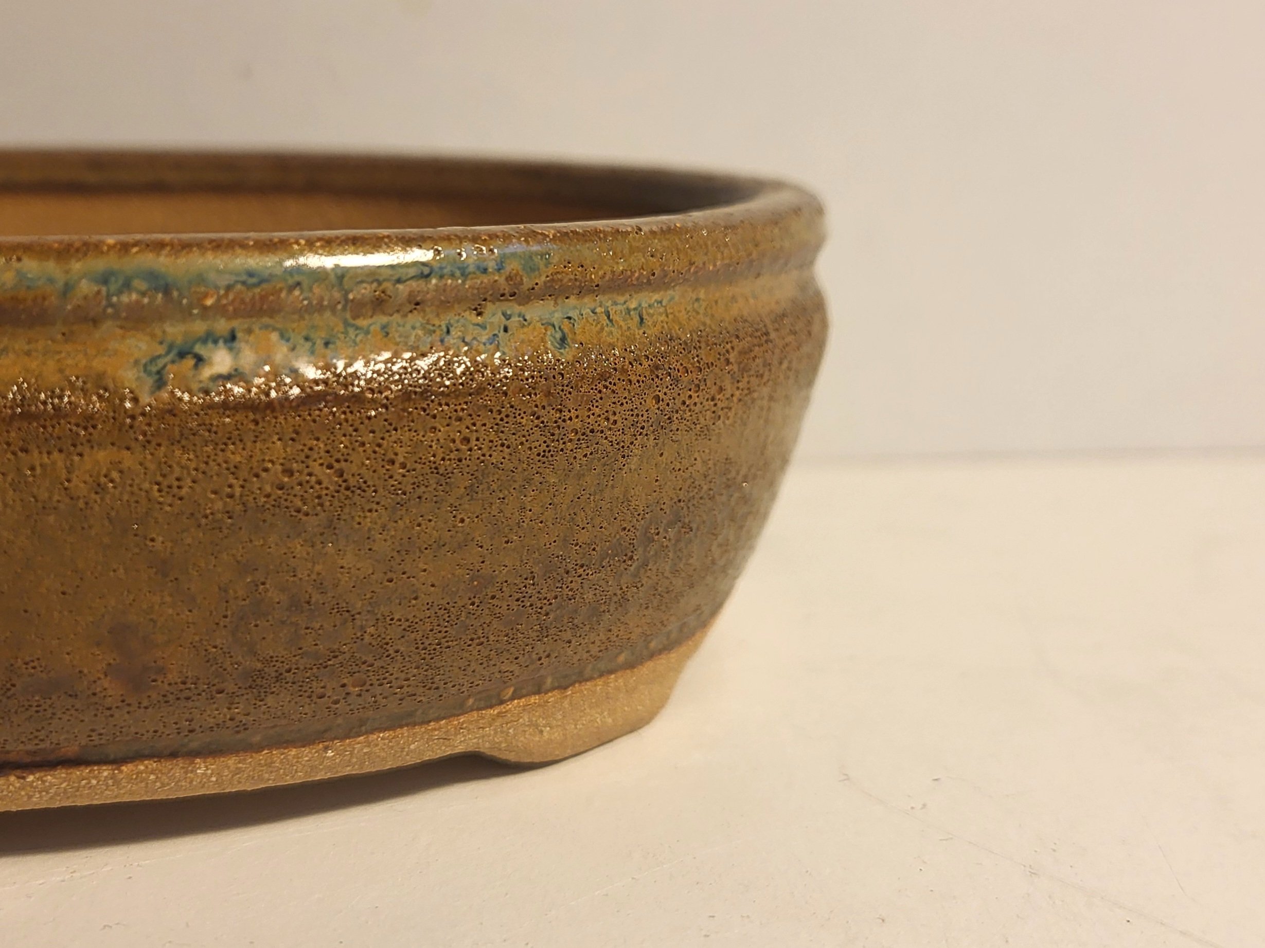 Pot ovale superposition d’émaux. Nuances bleu majoritairement marron.