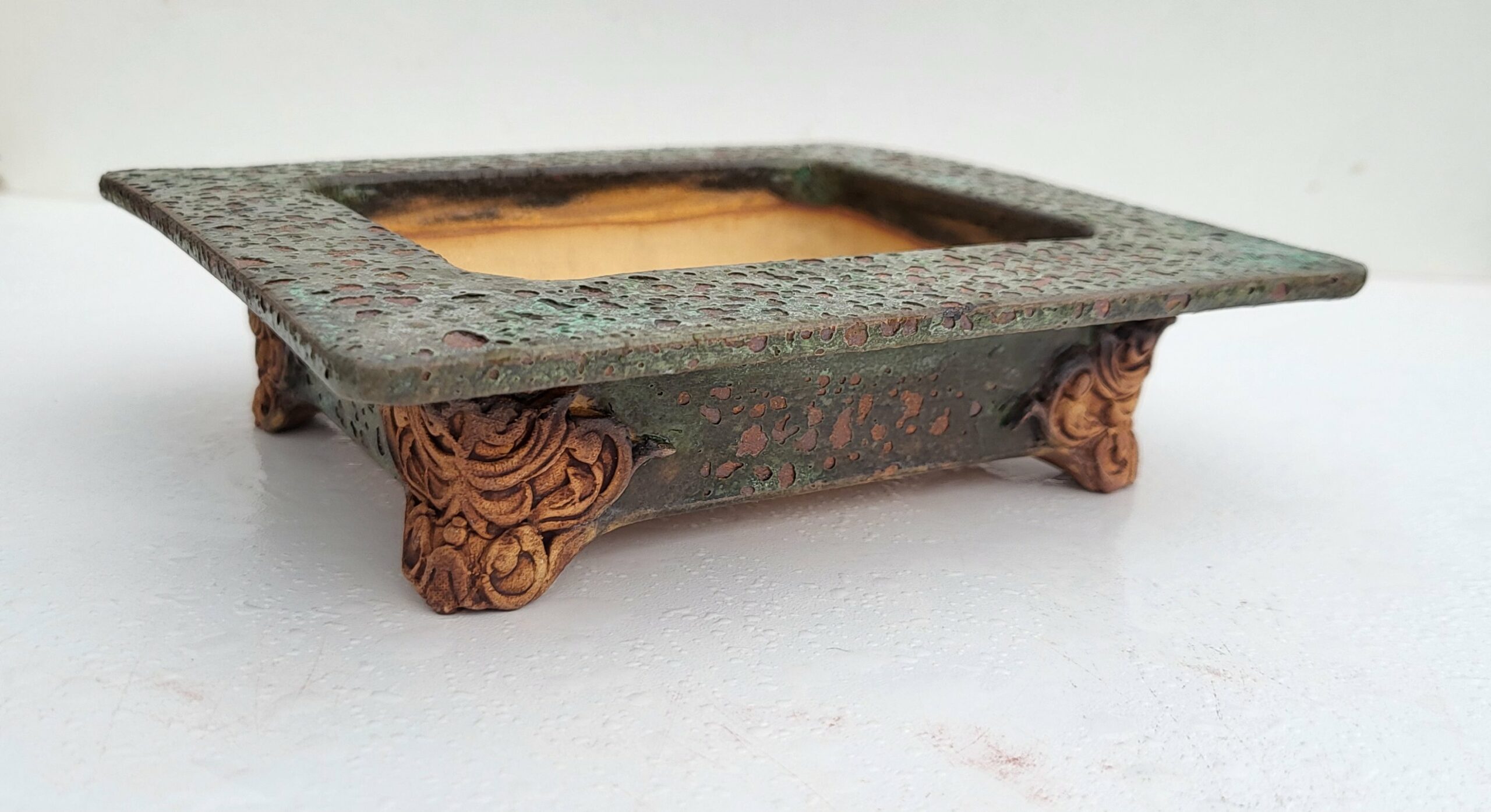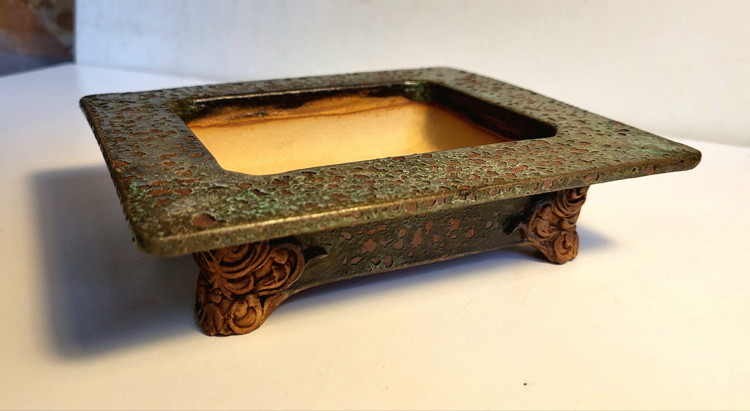 Pot atypique émail lichen. Aspect antique. Pieds travaillés.